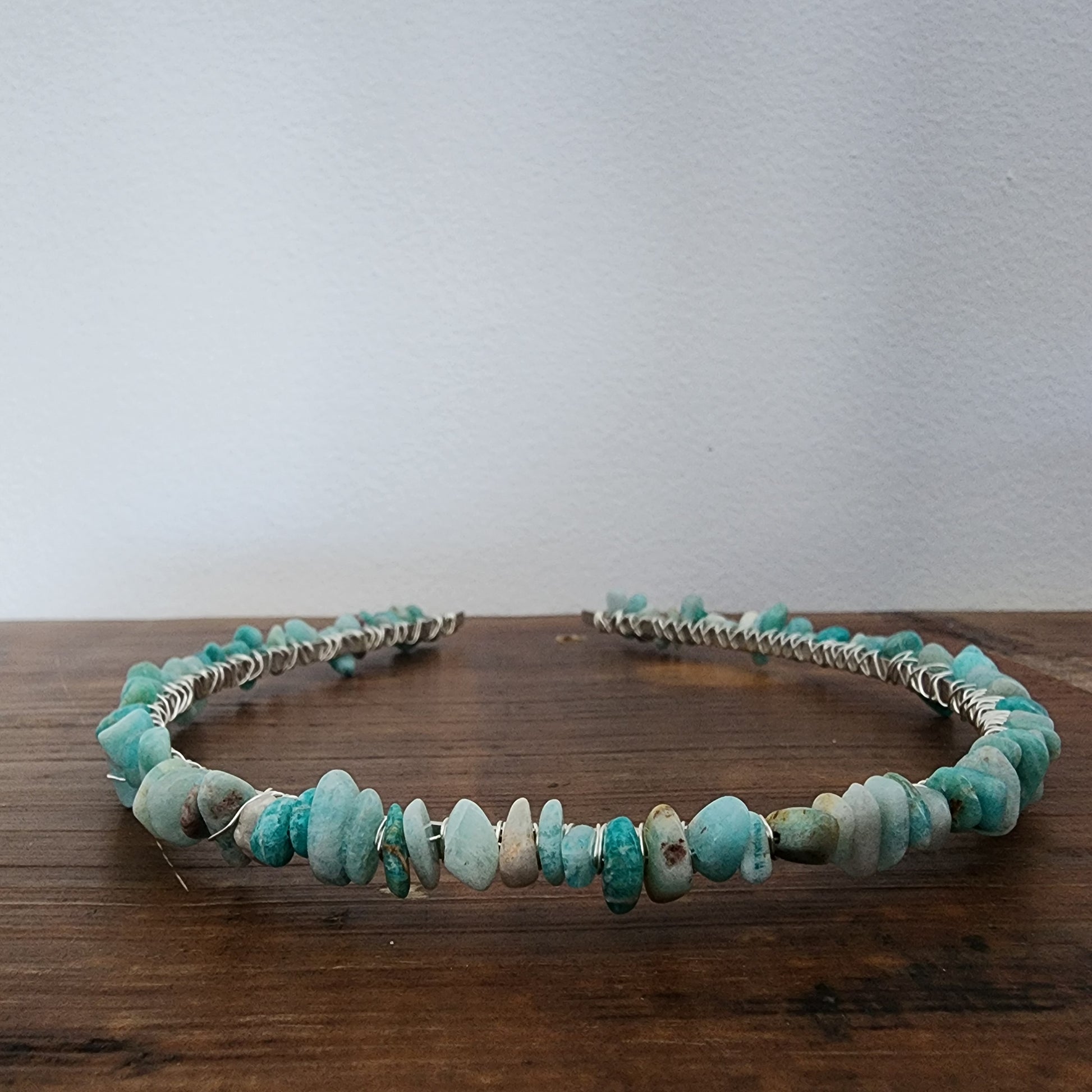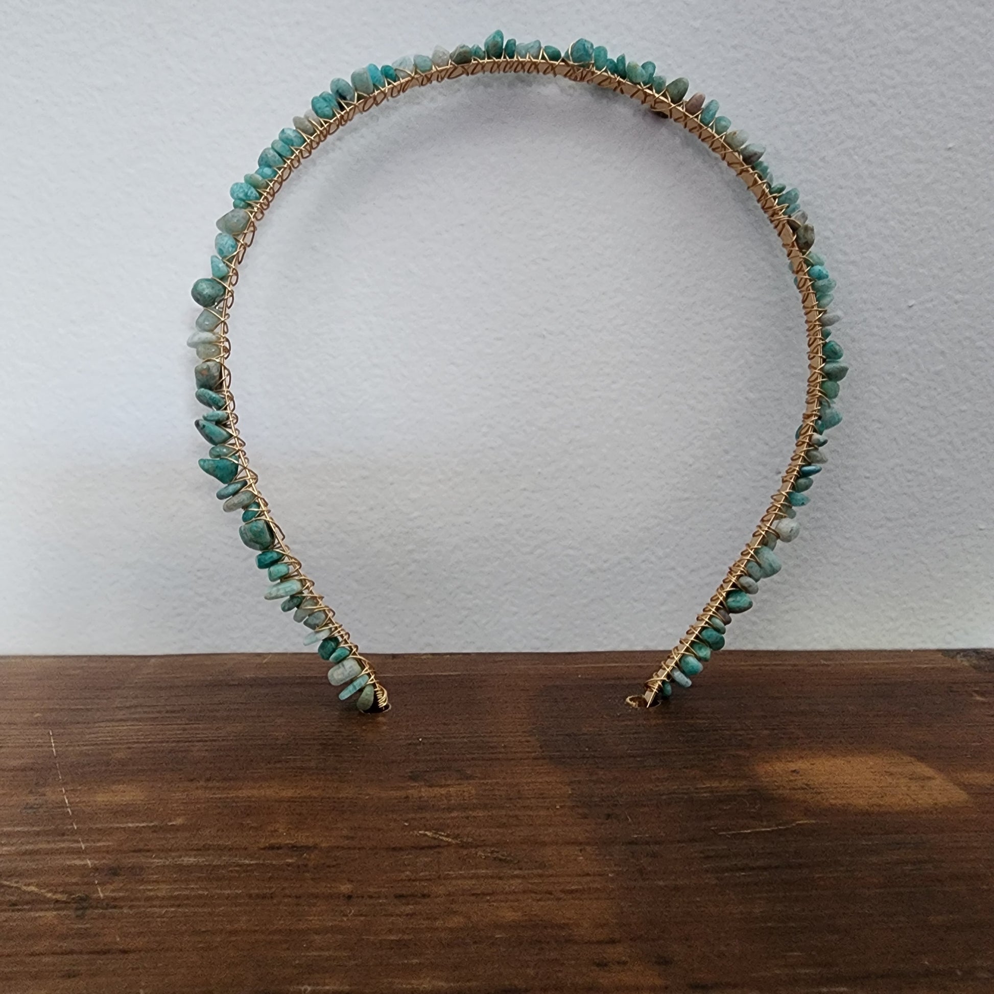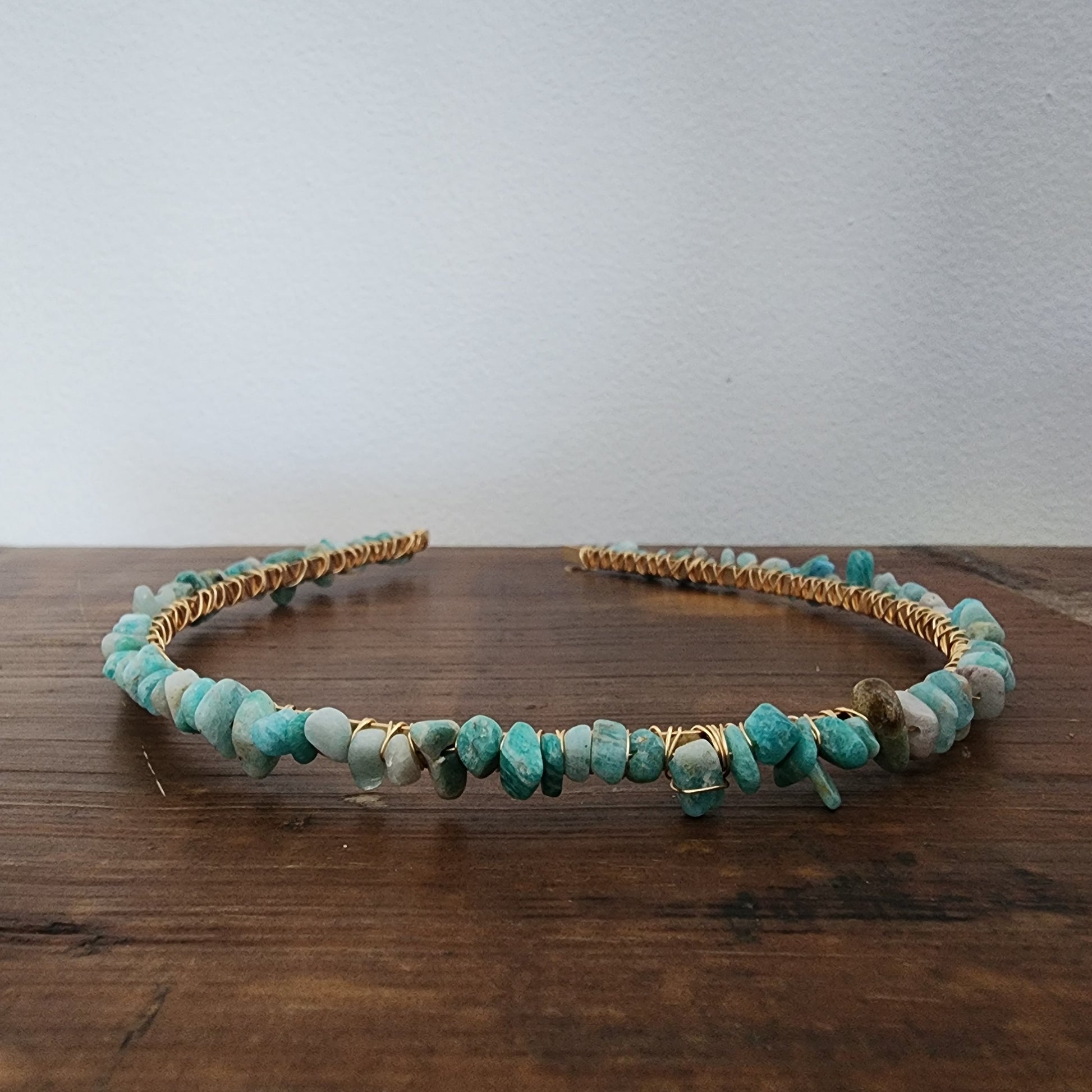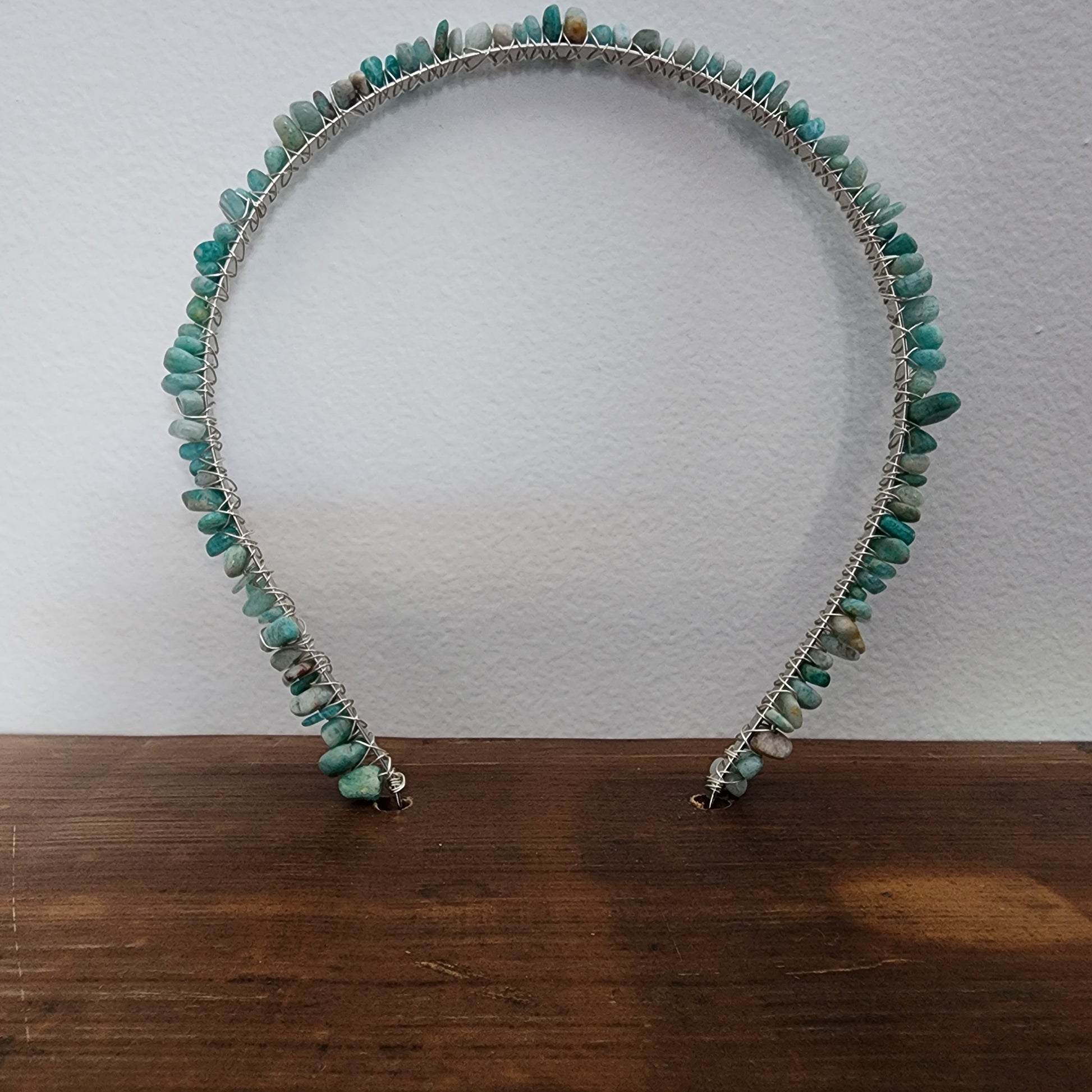 Reveal your honest beauty and self-confidence with this headband made from wire wrapped amazonite gemstones on a flexible headband. The combination of this headband makes it comfortable to wear every day while being elegant enough to dress up any look.