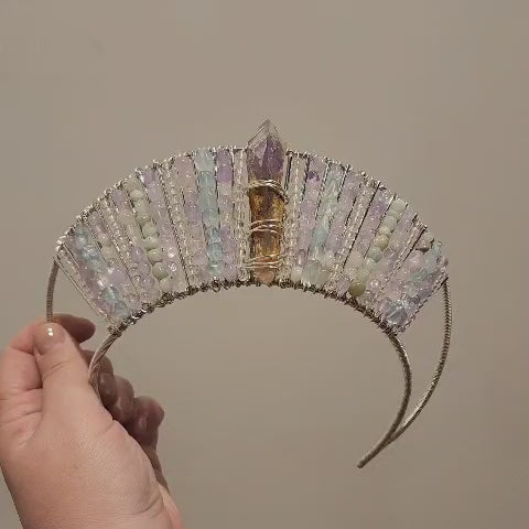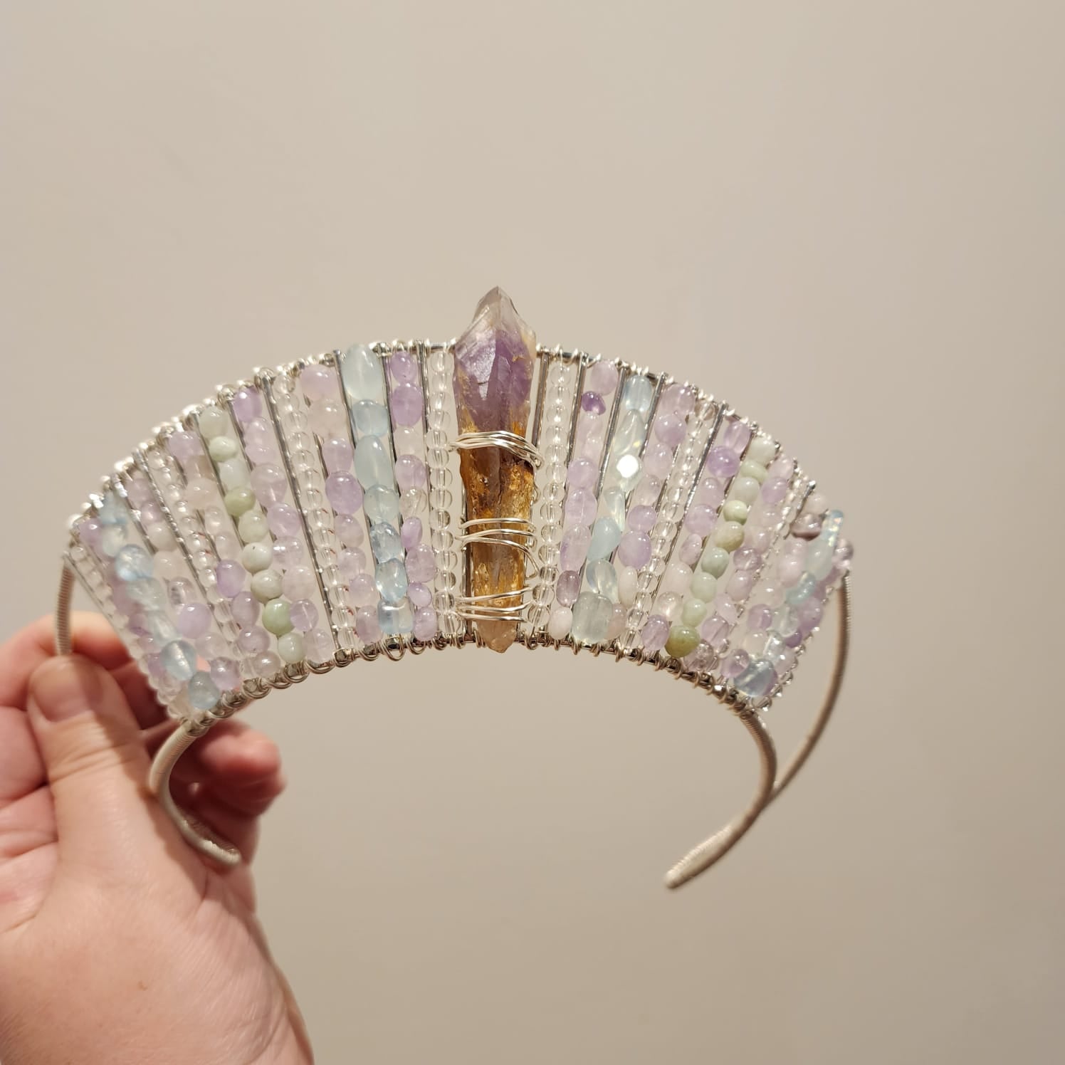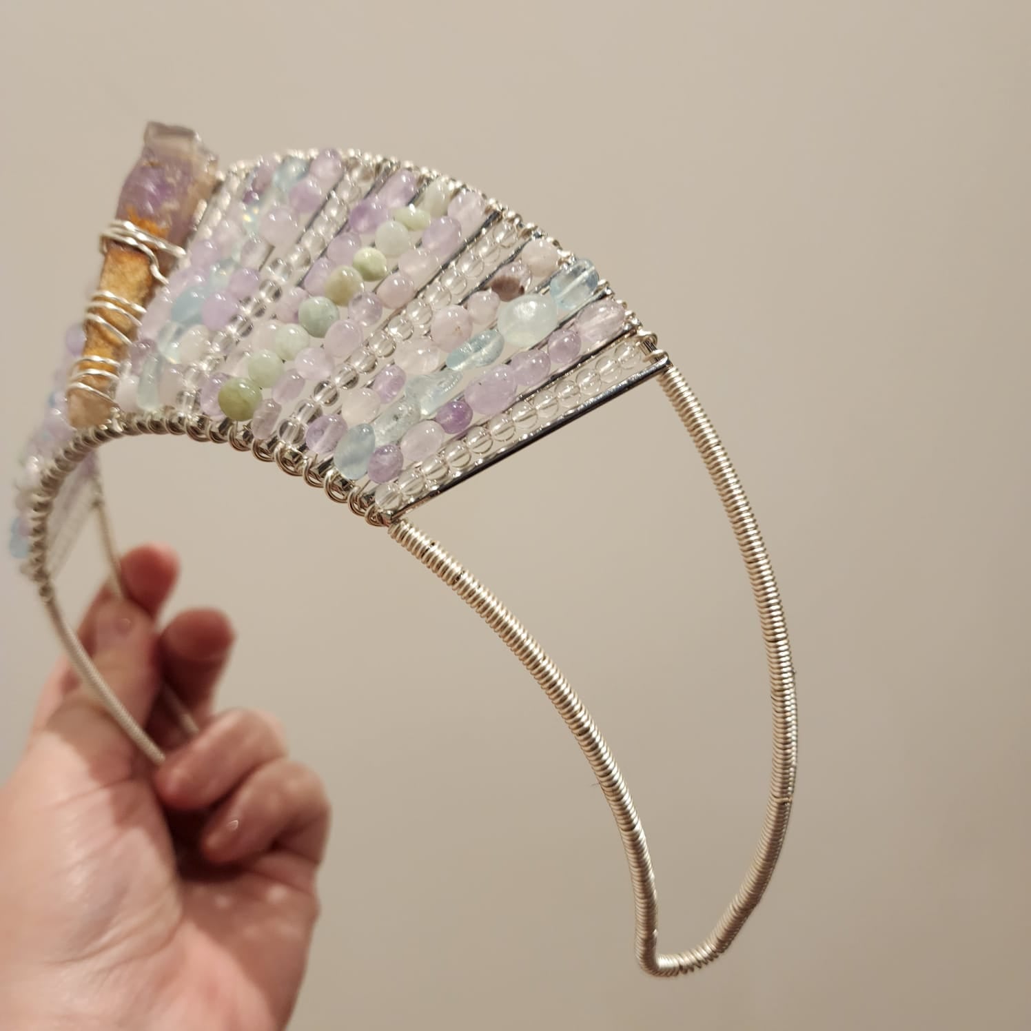 - Headband made from wire wrapped gemstones on an adjustable, plated, stainless steel crown base. Wire is high grade enamel coated copper.