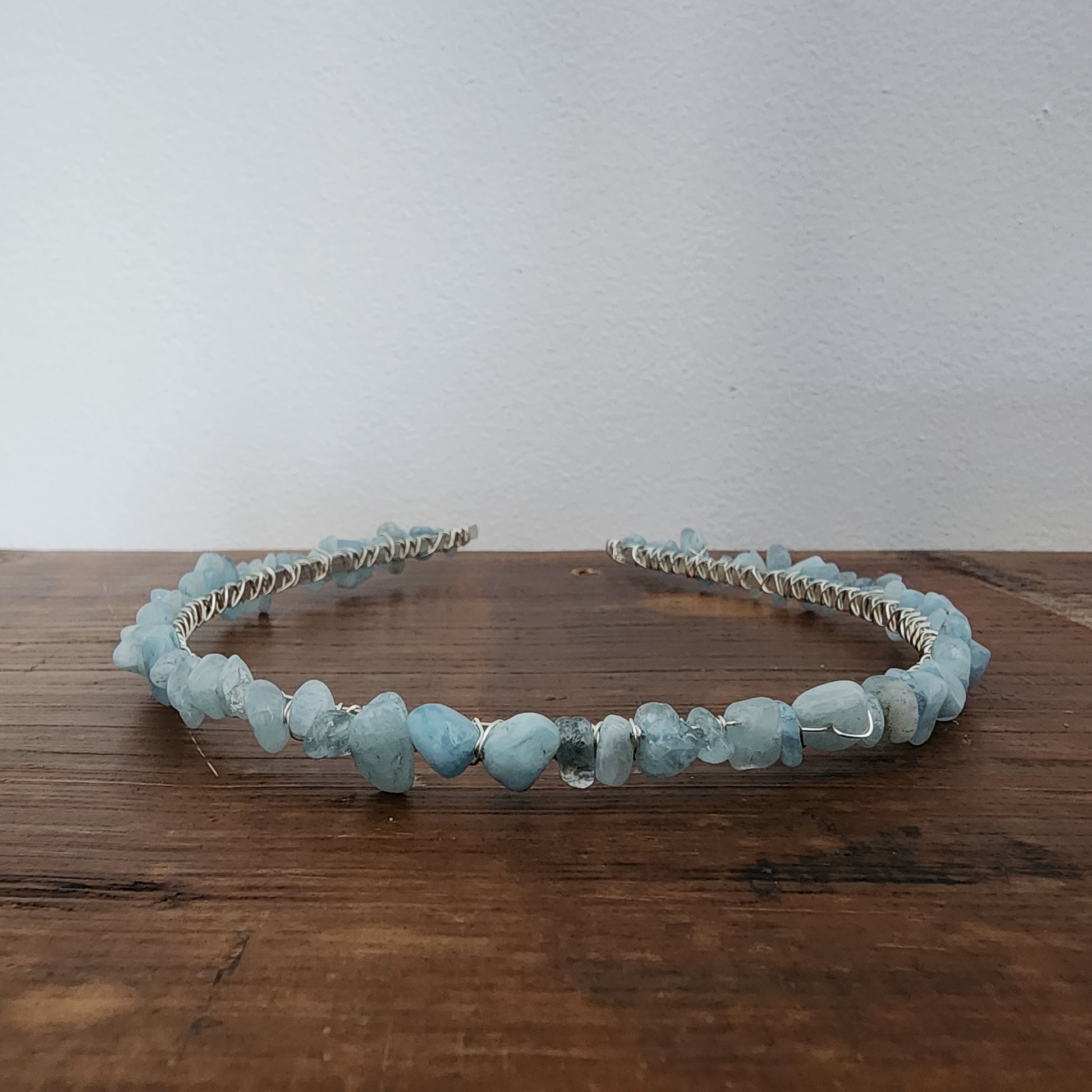 This Aquamarine Gemstone Headband is a boho dream, in wearable form. Made from wire wrapped gemstones on a flexable headband and handcrafted in Australia, the band will sit comfortably on all head sizes.
