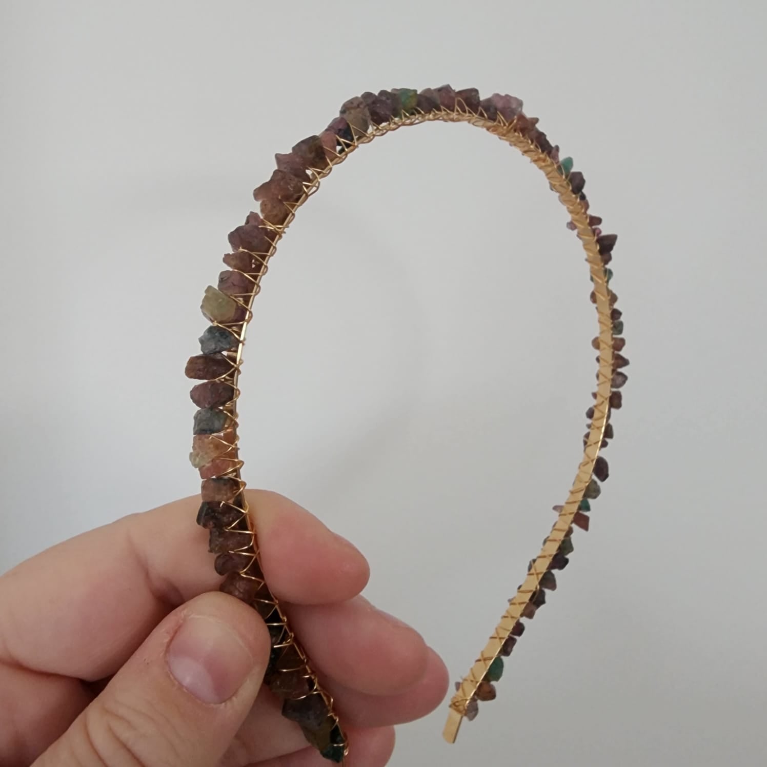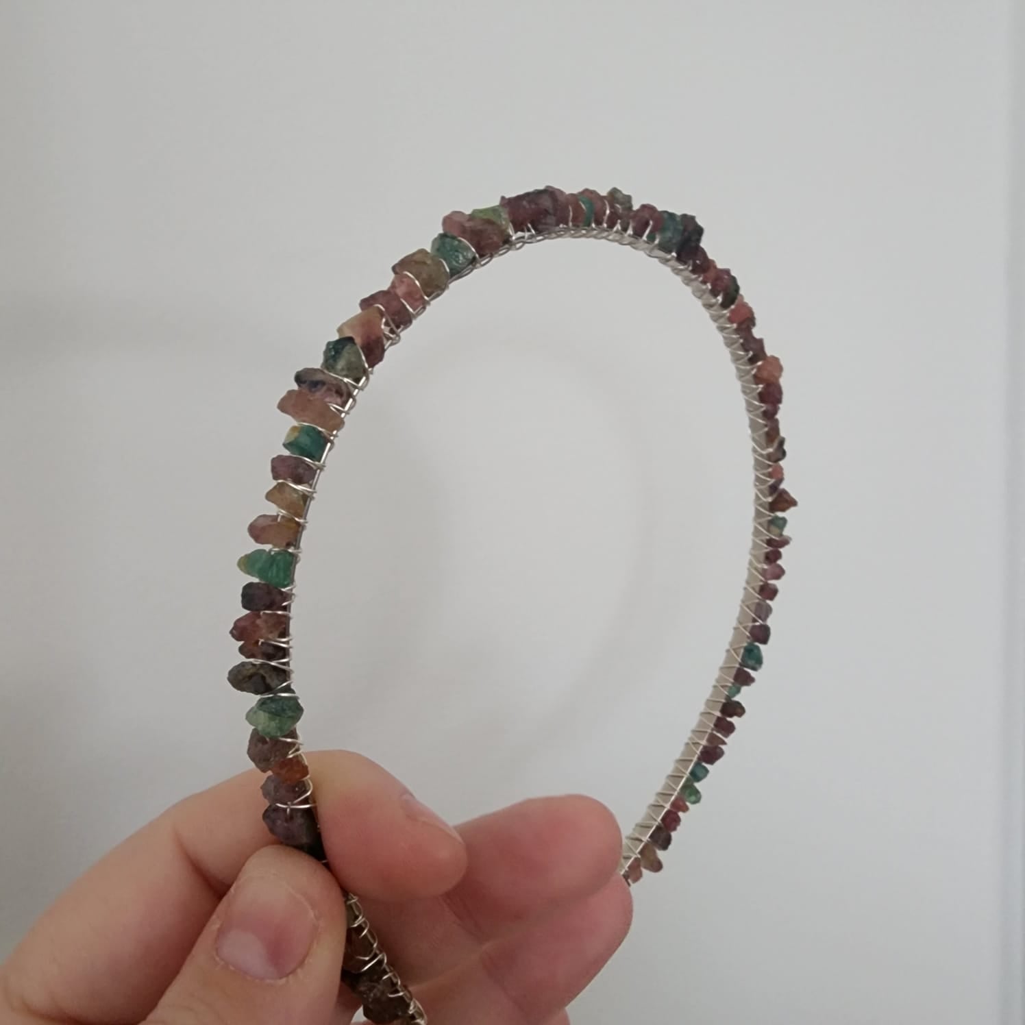 - Headband made from wire wrapped gemstones on a standard adult sized, plated, stainless steel headband that is 4mm wide. Wire is high grade enamel coated copper.