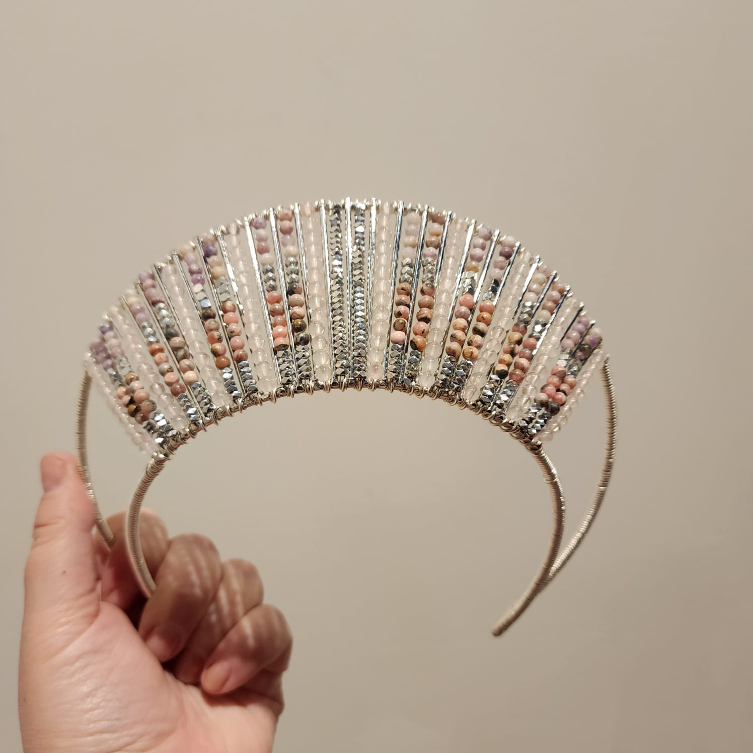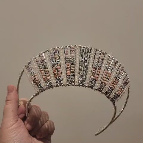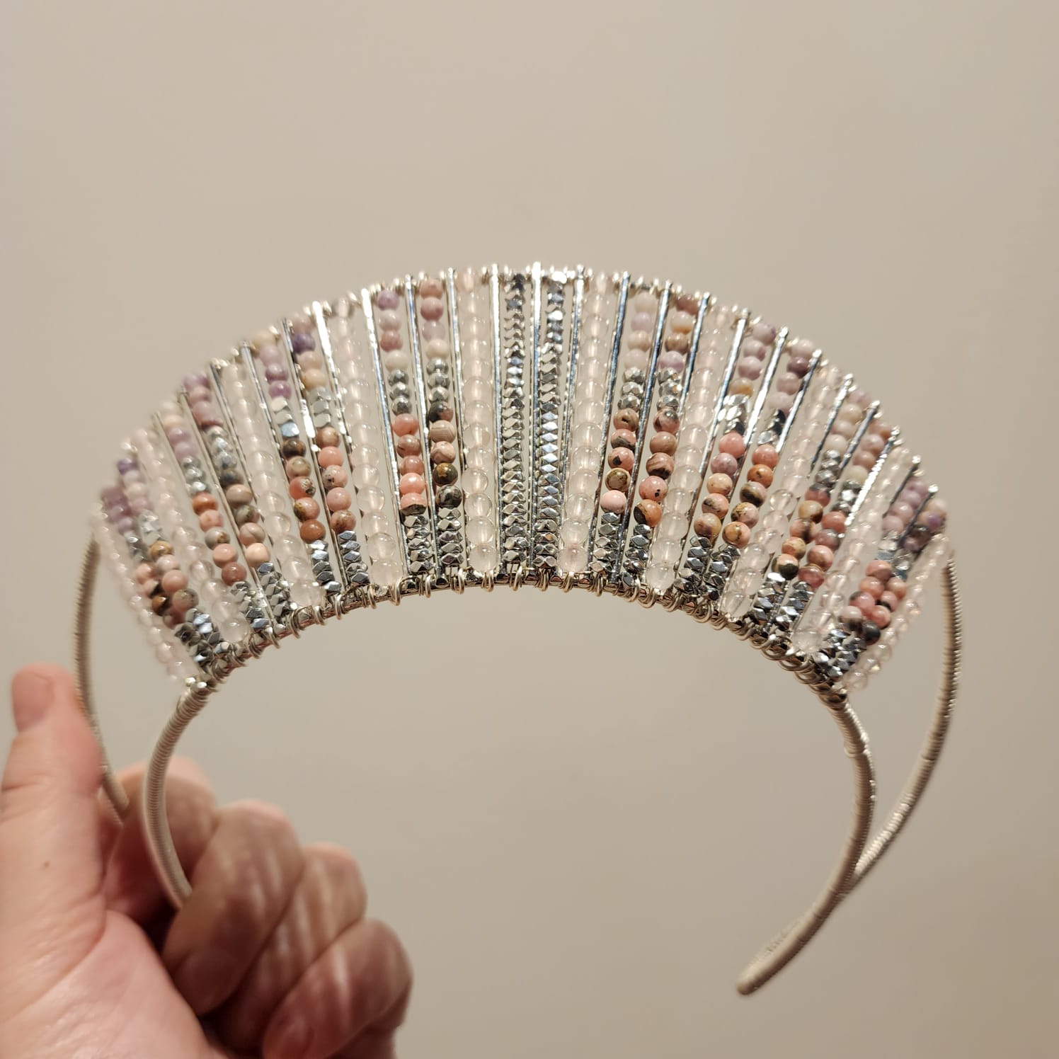 - Headband made from wire wrapped gemstones on an adjustable, plated, stainless steel crown base. Wire is high grade enamel coated copper.